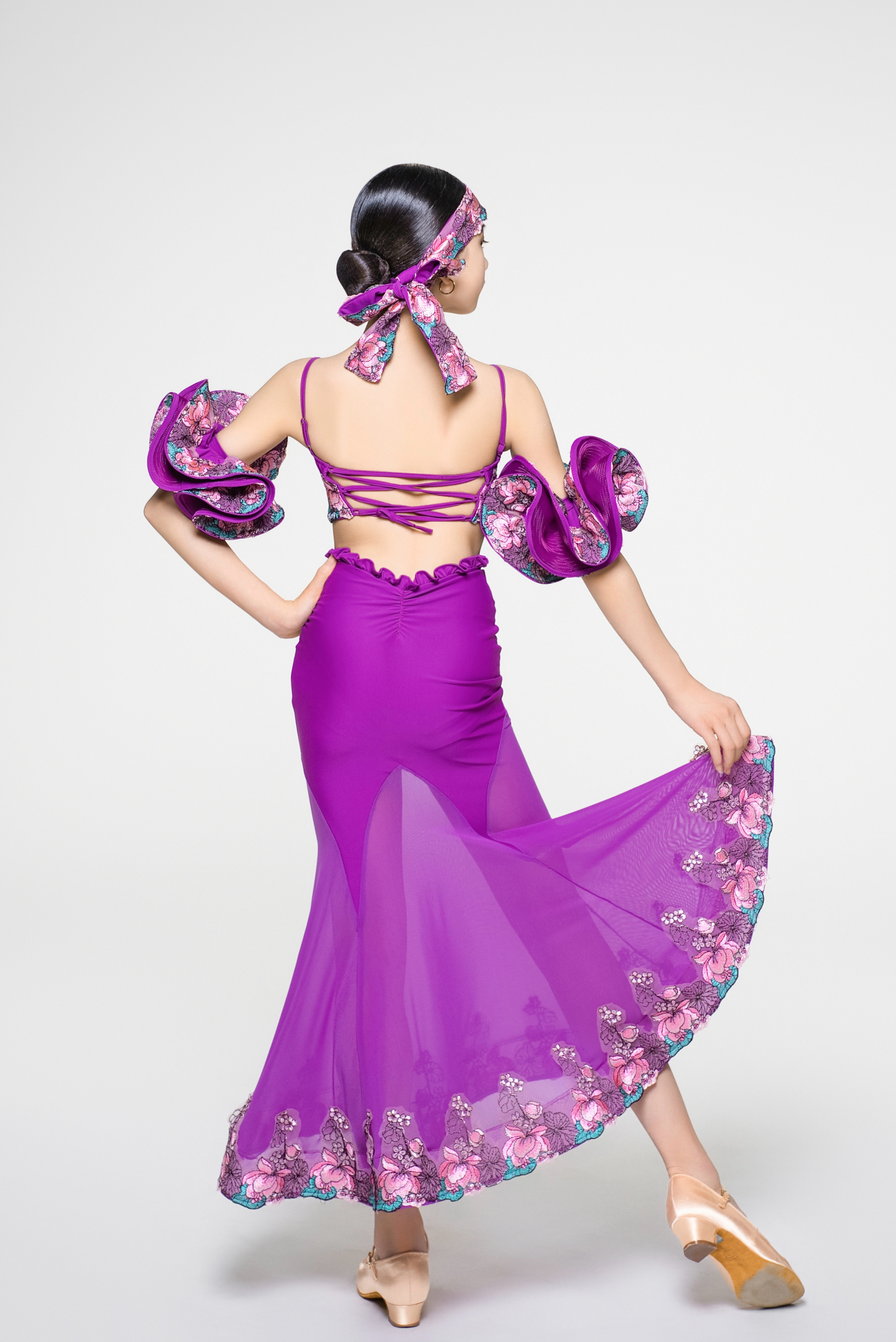 • Girls' Embroidered V - Waist Full - Flared Skirt (Violet)#250422