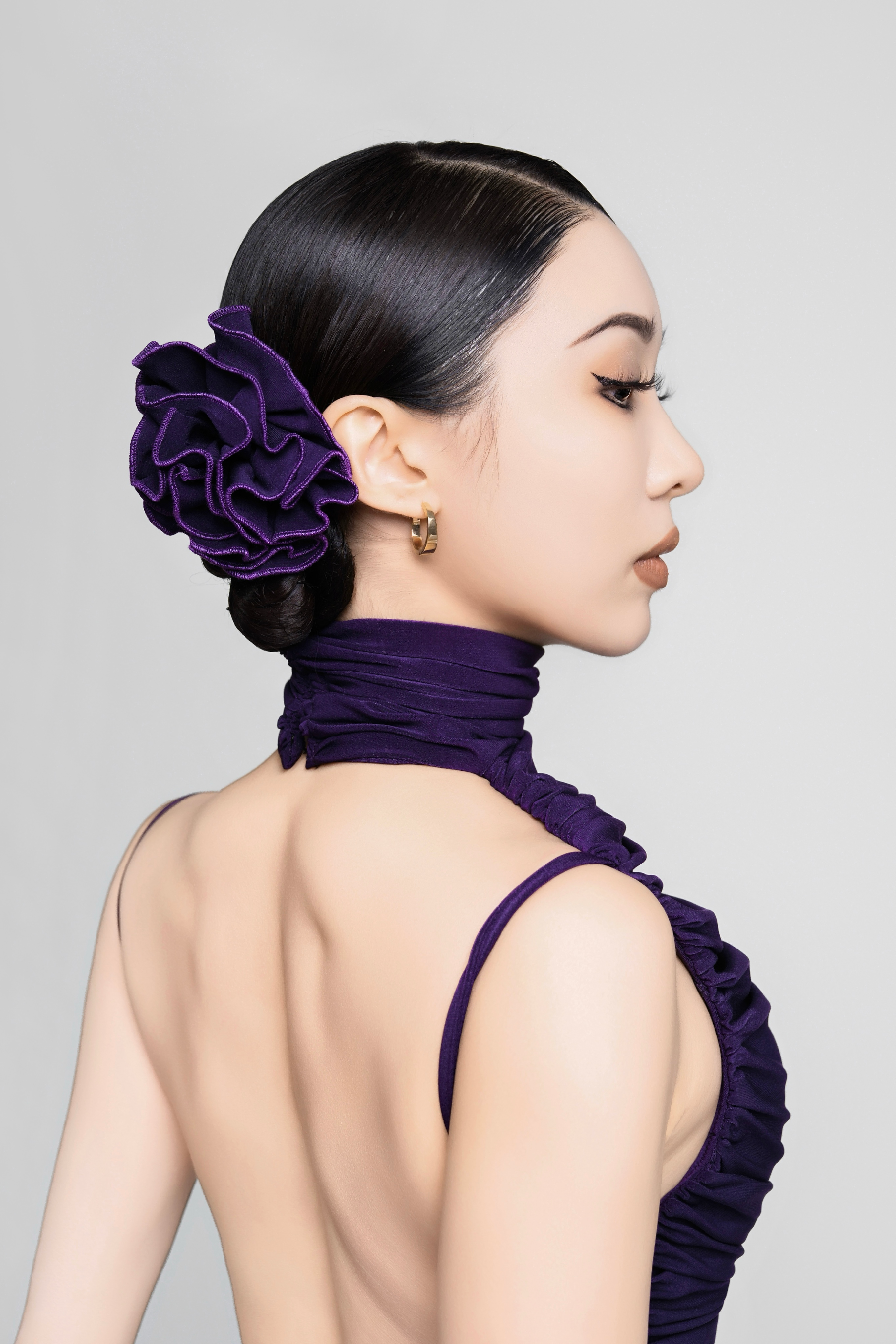 • Women's High Neck Ruched Sleeveless Long Dress (Purple / with Hair Accessories)